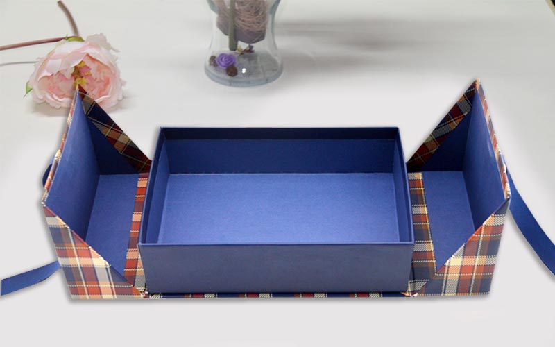 1.材質 :盒子採用157G銅版紙,單面彩色印刷,單面啞膜,裱1500G雙灰闆盒子内襯貼專藍色面紙,盒型爲雙開翻蓋盒,盒子正面粘2根藍色絲帶,此款包裝盒純手工制作
