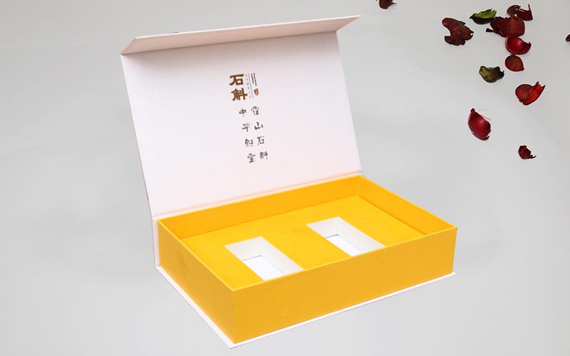 1.材質:盒子面紙用157G銅版紙  單面彩色印刷,單面啞膜裱1300G雙灰闆,盒子内托用白色EVA開模,兩款包裝盒的盒型結構爲翻蓋盒,簡單精緻上流水線制作。