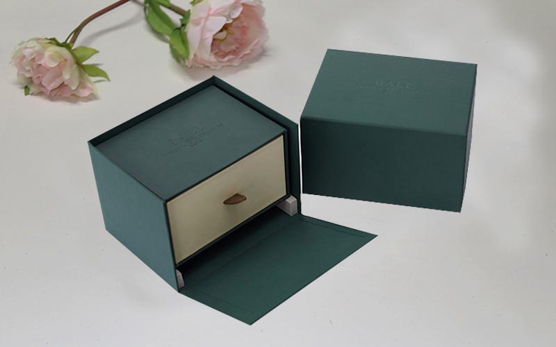 1.材質:綠色充皮紙光面特種紙表面文字LOGO壓印,裱1500G雙灰闆 盒子裏面是一個抽屜結構的盒型,材質一樣盒子的外觀和結構比較特殊,純手工制作外型精緻