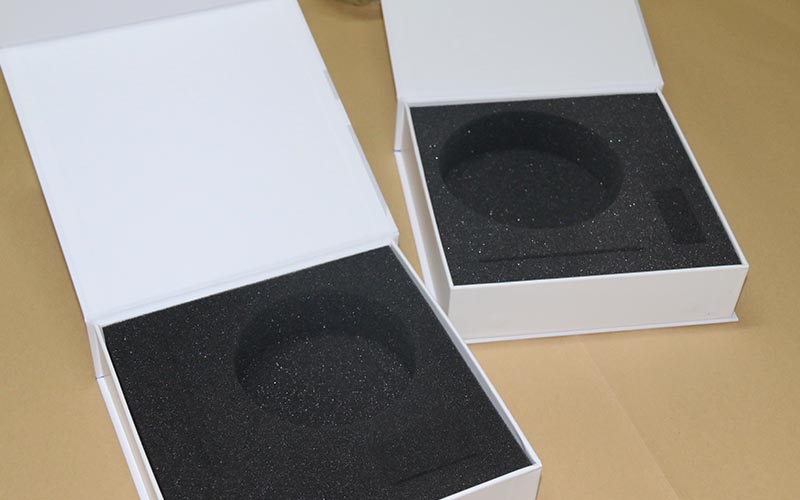 1.材質:盒子面紙採用157G銅版紙單面彩色印刷,單面啞膜。裱1500G雙灰闆,内盒材質和外殼一樣 。内托用黑色40密度的海綿 ,開槽位固定産品。整款包裝盒機械化制作,品質和外觀制作也比較好。