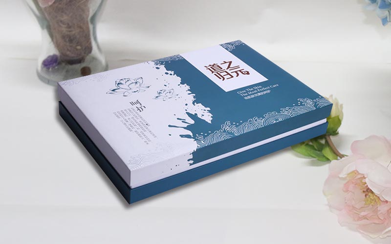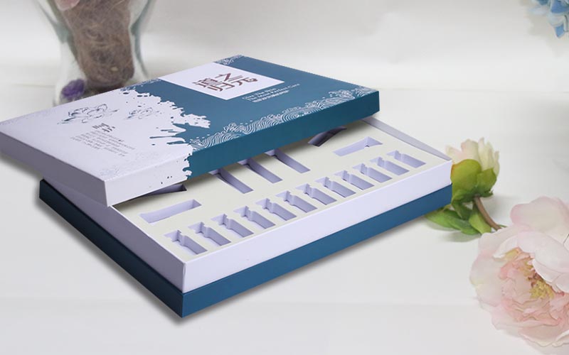 1.材質 :盒子面紙採用白色珠光紙彩色印刷,裱1500G雙灰闆,下盒白色珠光紙藍色印刷裱1500G雙灰闆,中間純白色珠光紙裱1500G灰闆做圍條。内托用白色EVA,但是最重要的是盒子表面裱一層1MM厚度的海綿,盒子摸起來也會更有手感,整款盒子手工制作。