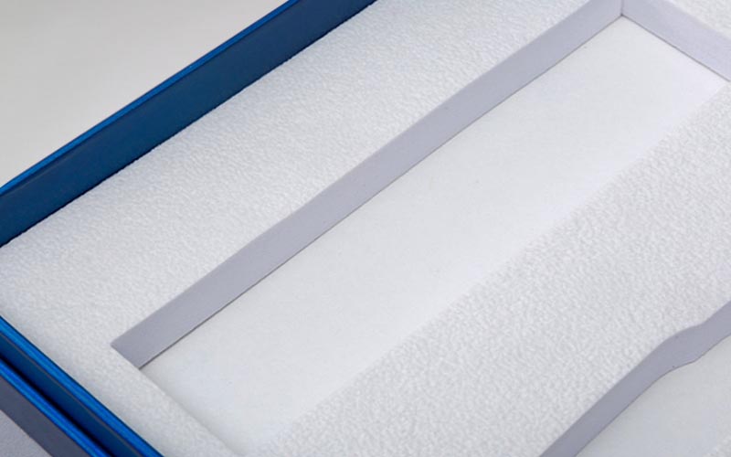 1.材質:1500g灰闆對裱藍色特種紙,内托採用瞭白色EVA植絨。工藝選擇瞭燙金跟uv工藝。